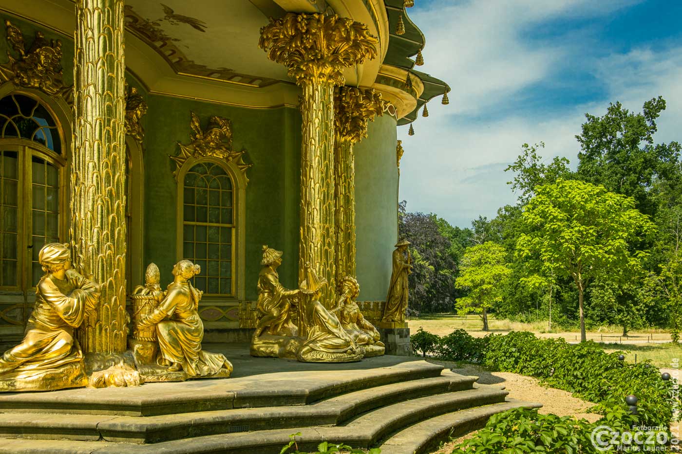 Die Außenansicht des Pavillons wird durch die lebensgroßen vergoldeten Figuren bestimmt, die einzeln oder in Gruppen um das Gebäude platziert sind. Dargestellt sind märchenhaft gekleidete chinesische Musikanten und Teetrinker, deren exotischer Charakter mit den Säulen in Form vergoldeter Palmen harmoniert. Peter Benckert und Johann Gottlieb Heymüller haben diese reizvolle Staffage „à la chinoise“ geschaffen.