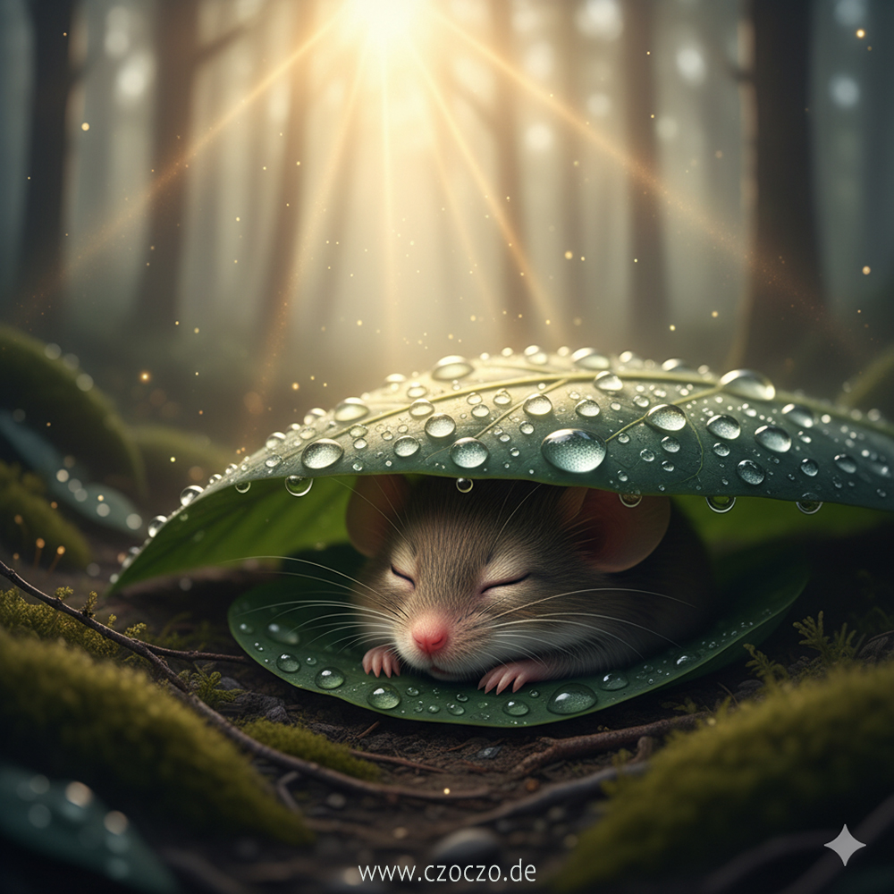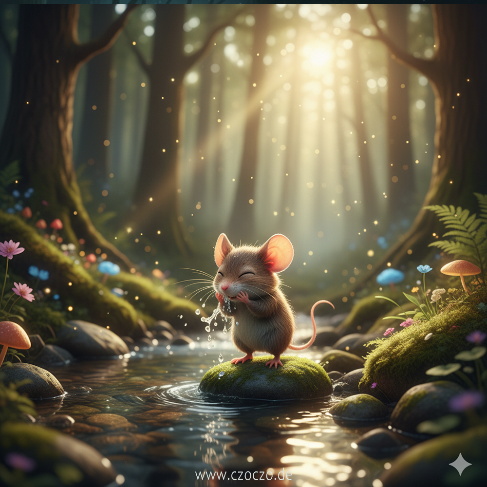Mit einem Ruck schob er das Blattdach beiseite und kroch hinaus. Kühle Luft strich über sein Gesicht. In der Nähe plätscherte ein Bach. Pieps folgte dem Klang und tauchte seine Pfoten ins klare Wasser. Er spritzte sich über Nase und Augen, bis sie glänzten, und lachte leise, als die Tropfen an seinen Schnurrhaaren glitzerten. „So, jetzt bin ich wirklich wach.“