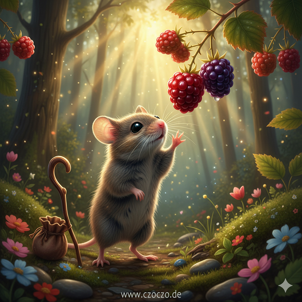 „Oh!“ rief er begeistert und packte eine Beere. Sie war fast so groß wie sein Kopf. Vorsichtig biss er hinein. Der Saft lief ihm über die Pfoten und schmeckte süß und frisch. Pieps lachte und stopfte sich gleich die nächste in den Mund. Schon bald war sein Bauch rund und zufrieden, und seine Schnurrhaare waren voller blauer Flecken. „Das war ein Festmahl“, murmelte er satt und glücklich, bevor er sich wieder auf den Weg machte.