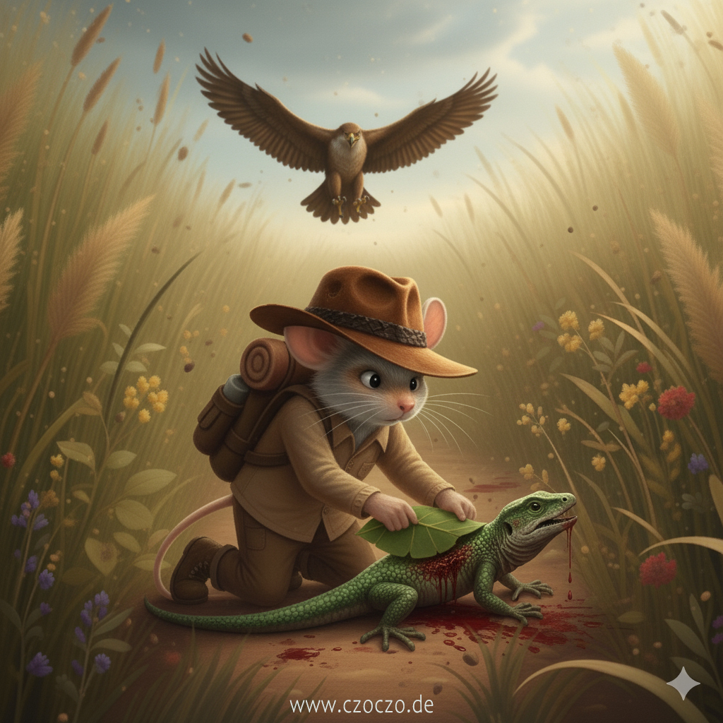 Pieps rannte zu der Eidechse, die reglos dalag. Ihre Seite war aufgeschlitzt, aber sie atmete. Behutsam legte er ein breites Blatt auf die Wunde.