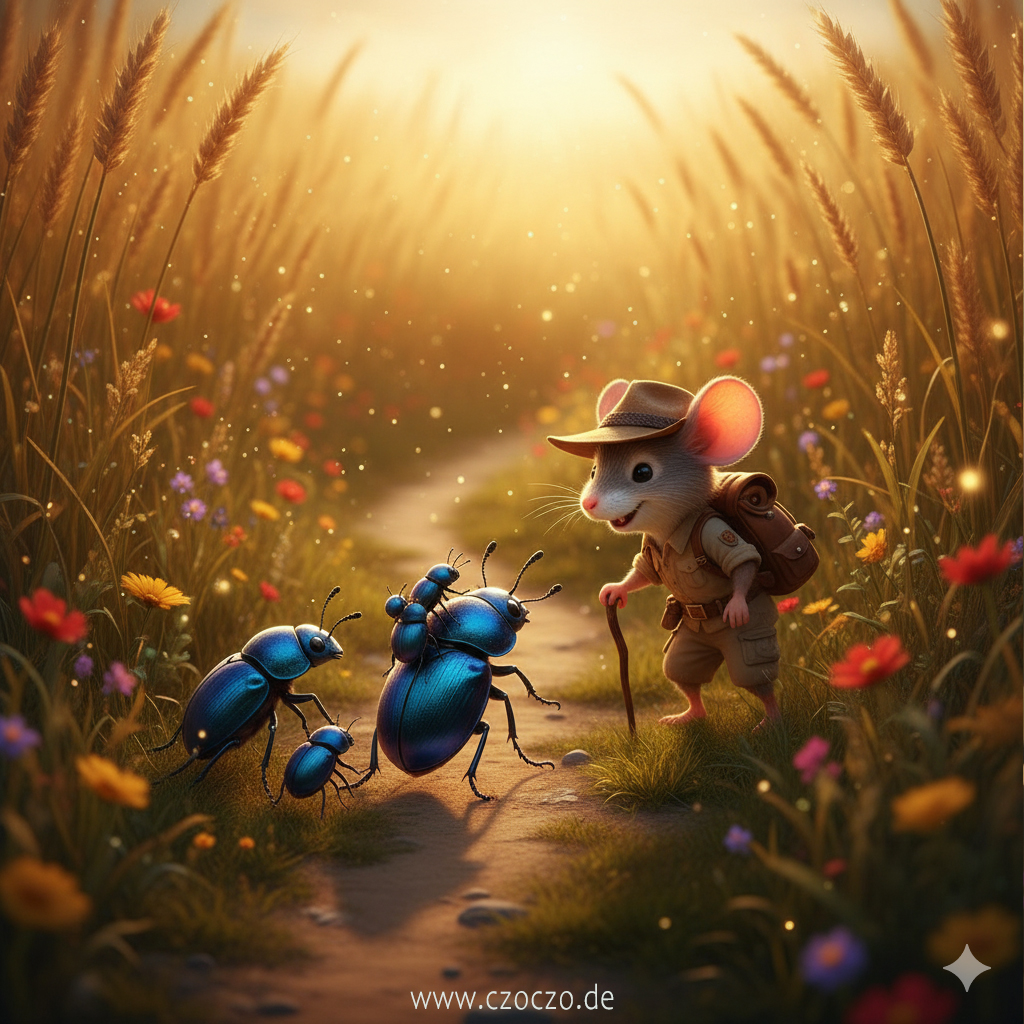 Sie lachten alle, doch in Herrn Dunggrüns Worten schwang ein ernster Unterton mit. Pieps blieb eine Weile, hörte den faszinierenden Erzählungen der Käferfamilie zu – von Stürmen, die wie Riesen brüllen, und der hohen Kunst, eine Kugel zu rollen, ohne sie in der Rinne zu verlieren. Schließlich trennten sich ihre Wege.