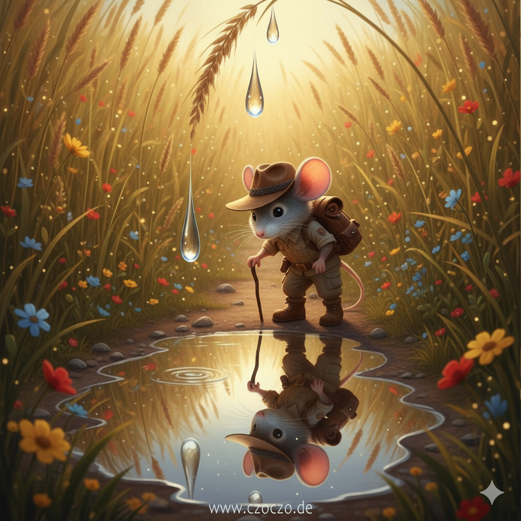 Bald entdeckte Pieps eine große Regenpfütze, die in der Sonne wie flüssiges Silber glänzte. Er beugte sich hinunter, betrachtete sein Spiegelbild und grinste. „Na, Pieps“, sagte er zu sich selbst, „du siehst ganz schön zerzaust aus.“