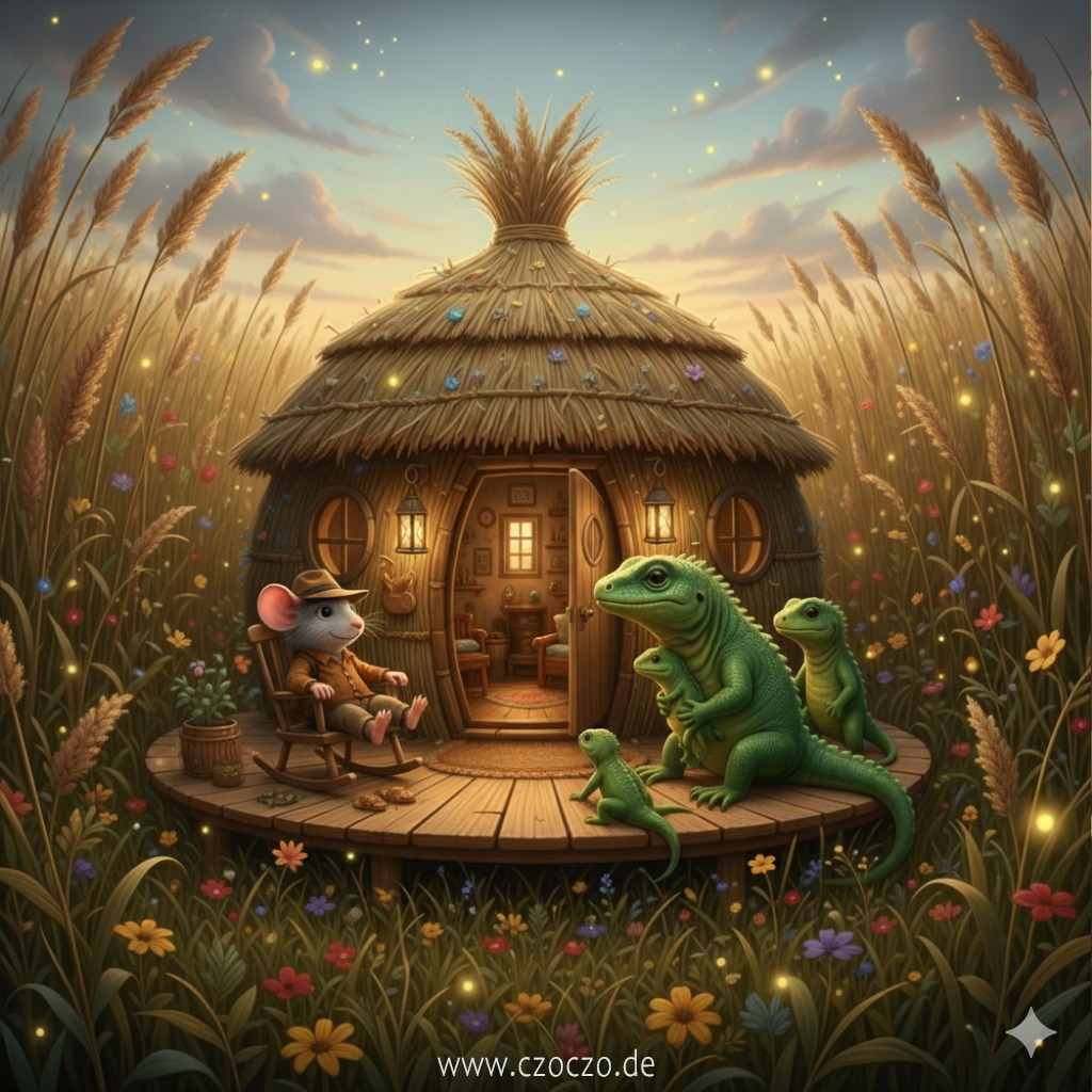 Nach einer Weile erreichten sie ein kleines, gemütliches Haus, versteckt zwischen dicken Gräsern. Davor spielten drei kleine Eidechsen, und in der Tür stand Frau Elara Grasgrün.
