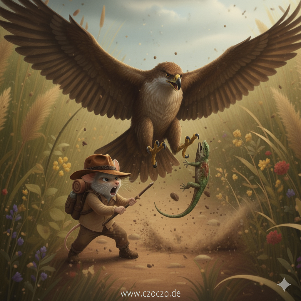 Der riesige Vogel, völlig überrascht von dem winzigen, unerwarteten Angreifer, flatterte erschrocken zurück. Mit einem wütenden Kreischen erhob er sich in die Luft – und ließ seine Beute fallen.