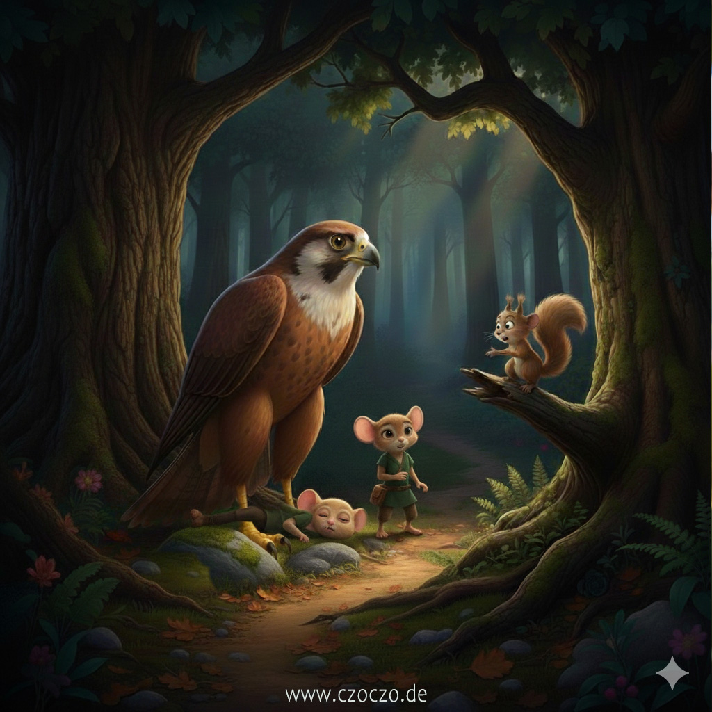 „Pieps’ Zuhause ist an der alten Eiche! Wir zeigen es euch!“, rief das mutigste Eichhörnchen. Die anderen Tiere beobachteten das ungewöhnliche Trio – Falke, Strandläuferin und die verletzte Maus – nur von Weitem.