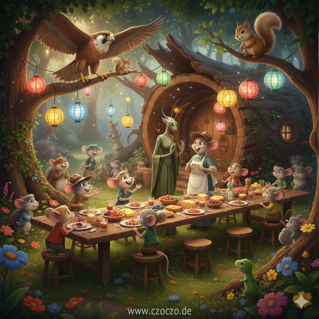Überall sah er vertraute Gesichter, die ihm auf seiner Reise geholfen hatten. Er sah seine Mutter, die sich weinend vor Rührung die Tränen wegwischte. Dort stand Azaela, die weise Wächterin des Waldes, die warm mit Mina lachte, während sie Beeren für die Gäste aufschüttelte. Er sah die schillernde Käferfamilie aus dem Grasmeer, deren leuchtend bunte Flügel nun im Sonnenlicht auf einem Pilz tanzten. Sogar Elisa Grasgrün und seine gesamte Familie waren gekommen, deren unermüdliche Kinder ausgelassen mit Pieps‘ eigenen, jetzt mucksmäuschenstillen Geschwistern Fangen spielten.