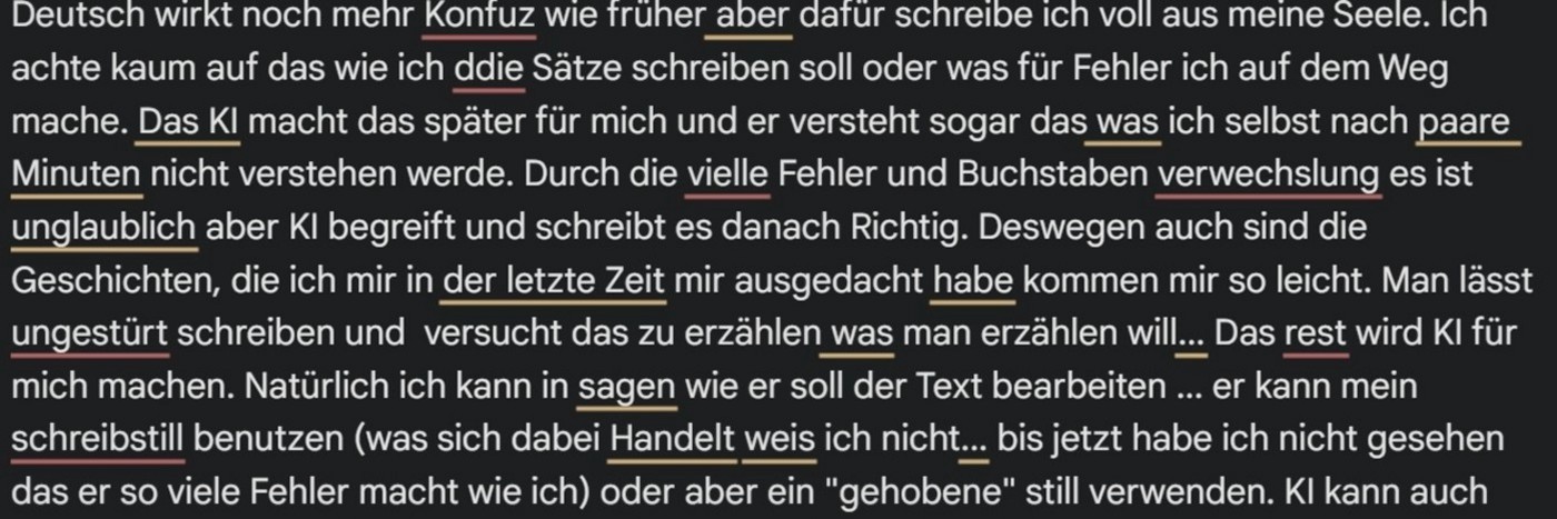 Obwohl… wenn ich meine Texte sehe, bevor sie durch die KI überprüft werden, sehe ich, dass ich mit der Zeit immer „schlechter“ schreibe. Mein Deutsch wirkt noch konfuser als früher, aber dafür schreibe ich jetzt voll aus meiner Seele! Ich achte kaum noch darauf, wie ich die Sätze bauen soll oder welche Fehler ich mache.
