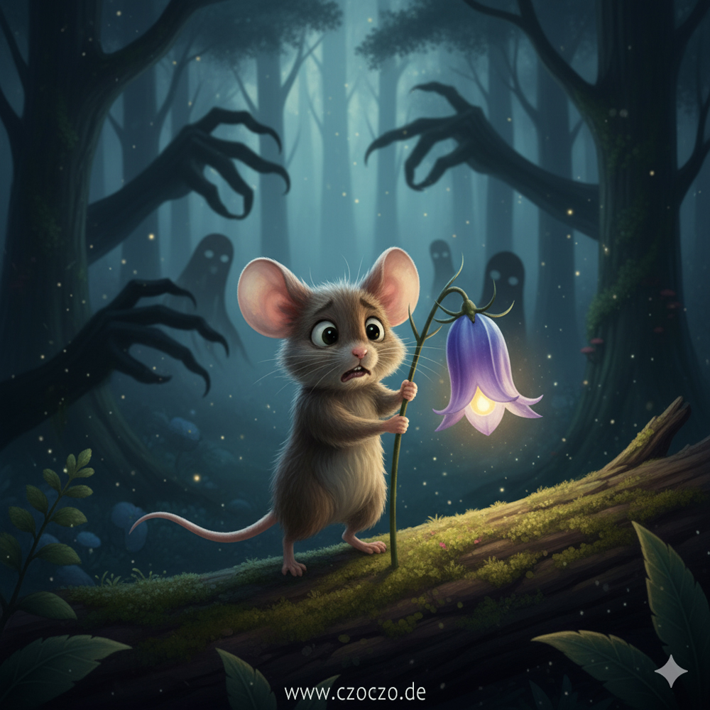 Pieps setzte die Pfoten auf den kühlen, feuchten Waldboden. Er spürte sofort, wie die Angst von neuem an seinen kleinen Füßen zog. Der Wind, der eben noch wie ein sanftes Flüstern klang, schien jetzt durch die Blätter zu pfeifen. Überall, wo die Laterne nicht einleuchtet, schien sich etwas zu verbergen. Die Gesten der Bäume – all die Äste, die wie Finger in die Dunkelheit ragten – wurden länger und unheimlicher.