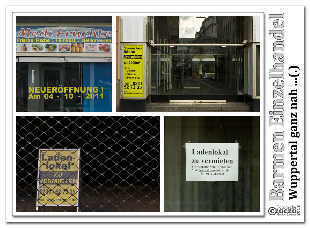Wuppertal Barmen mit seiner „Einkaufsmeile“ gehört bestimmt nicht zu der schlechtesten Orten . Es liegt Zentral in Wuppertal an der B7 mit direkter Verbindung von Bahnhof und Schwebebahn. Es könnte wirklich eine gute Adresse für den Einzelhandel sein. Könnte ist es aber nicht . Trotz der guten Lage verlassen immer mehr Händler und Dienstleister die Barmen und seine Fußgänger Zone . Dadurch entstehen immer mehr Leerstände ,die die Attraktivität des Ortes seit Jahren nur schadet .